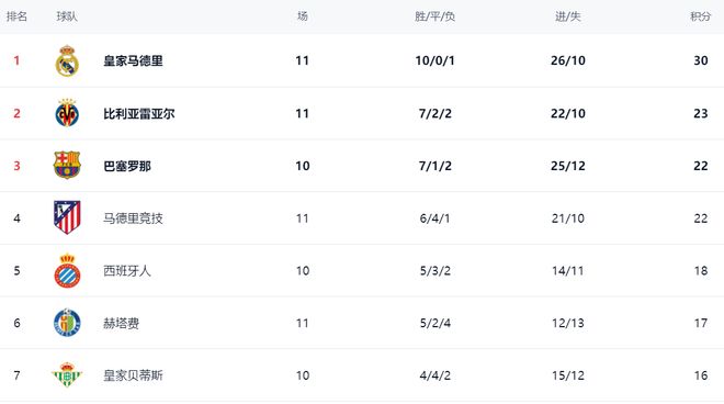 在積分榜上,皇馬10勝1負的戰(zhàn)績太出色了,以30分高居榜首。比利亞雷亞爾7勝2平2負,拿到23分,排名第2。少賽一輪的巴薩只有22個積分,排名第3。馬競也是22分,凈勝球落后,只能排名第4。西班牙人18分排名第5。第6的是赫塔費,拿到17分。
